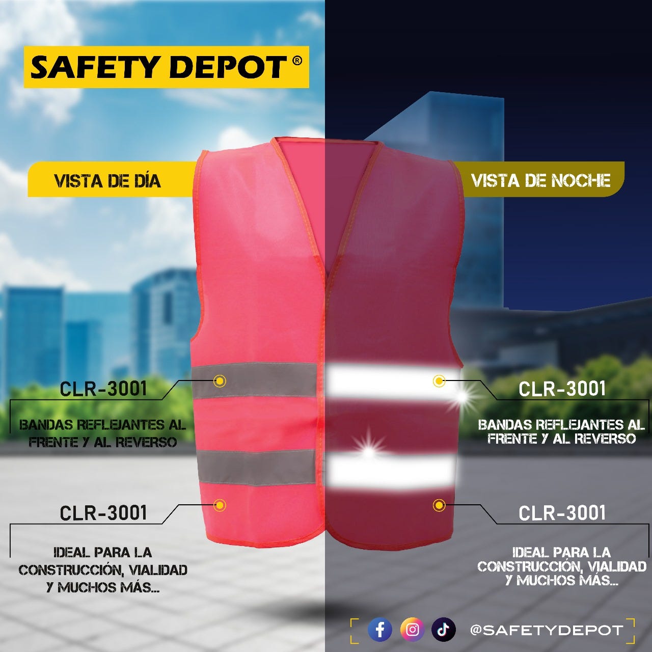 El chaleco CLR-3001 de Safety Depot está diseñado para protegerte en cualquier condición. Sus bandas reflejantes ubicadas al frente y al reverso garantizan que seas visible tanto con luz natural como en la oscuridad. Perfecto para construcción, trabajos viales y muchas otras actividades, el CLR-3001 combina seguridad, comodidad y resistencia.